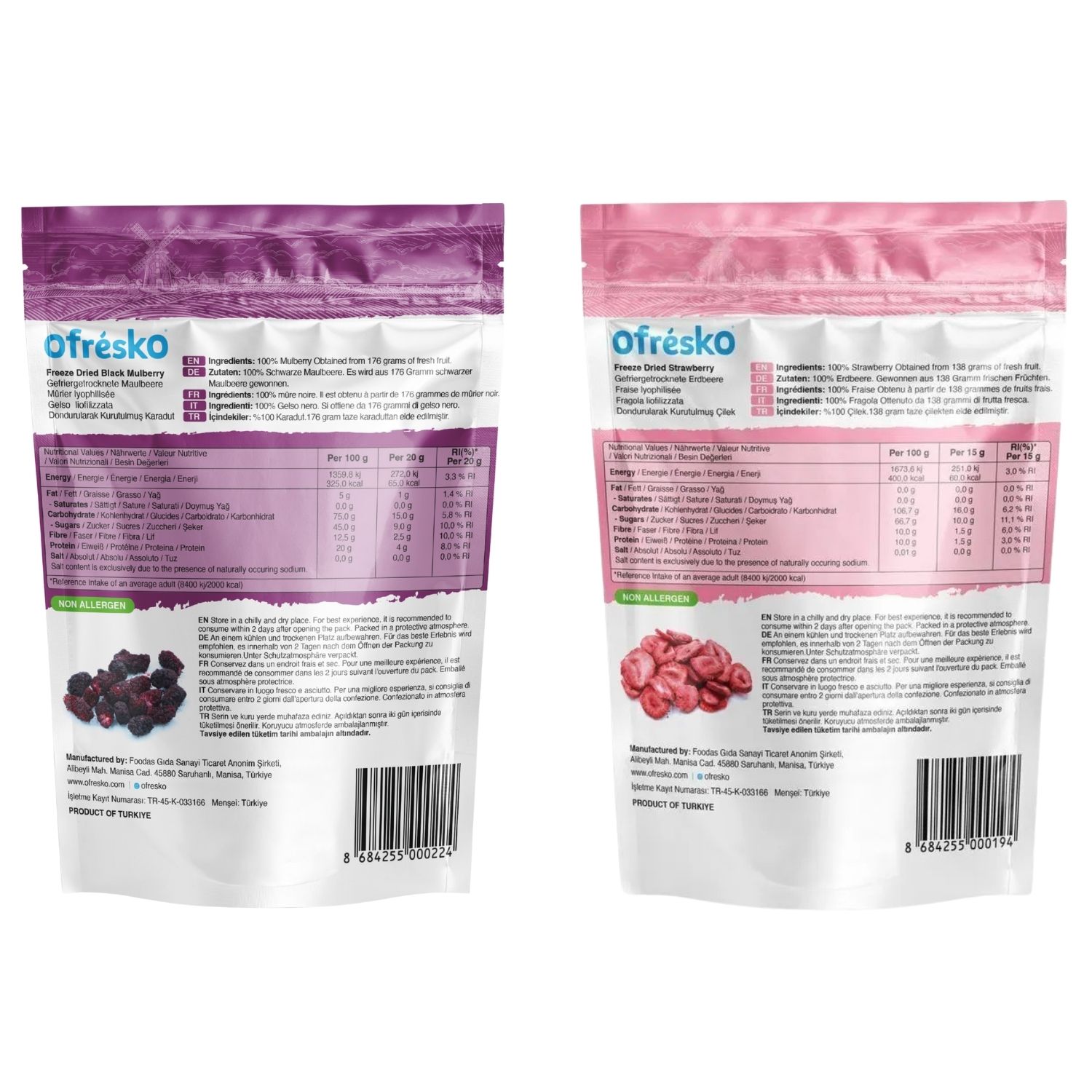 Tüm Ofrésko ürünleri %100 yerli olarak Türkiye’de üretilir, kontrollü tarım uygulaması ile yetiştirilen meyvelerimiz sertifikalı yerel üreticilerden ve bahçelerimizden sağlanmaktadır. Ofrésko kurutulmuş meyveleri yalnızca meyvenin kendi şekerini içerir, ekstra bir tatlandırıcı veya katkı maddesi içermemektedir. Dondurarak kurutma yöntem en sağlıklı ve en iyi meyve kurutma yöntemi olarak kabul edilir. Dondurma işlemi mikrobiyolojik süreçleri yavaşlattığı için ürünün bozulmasını geciktirir ve raf ömrünü uzatır.