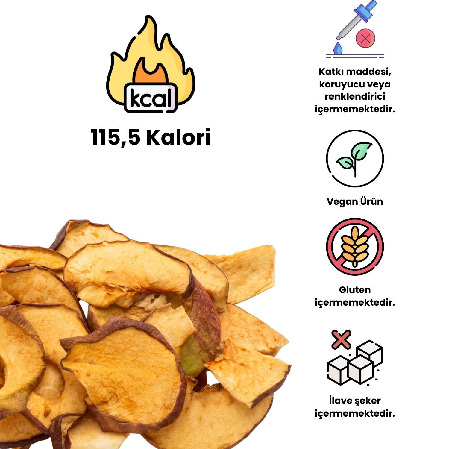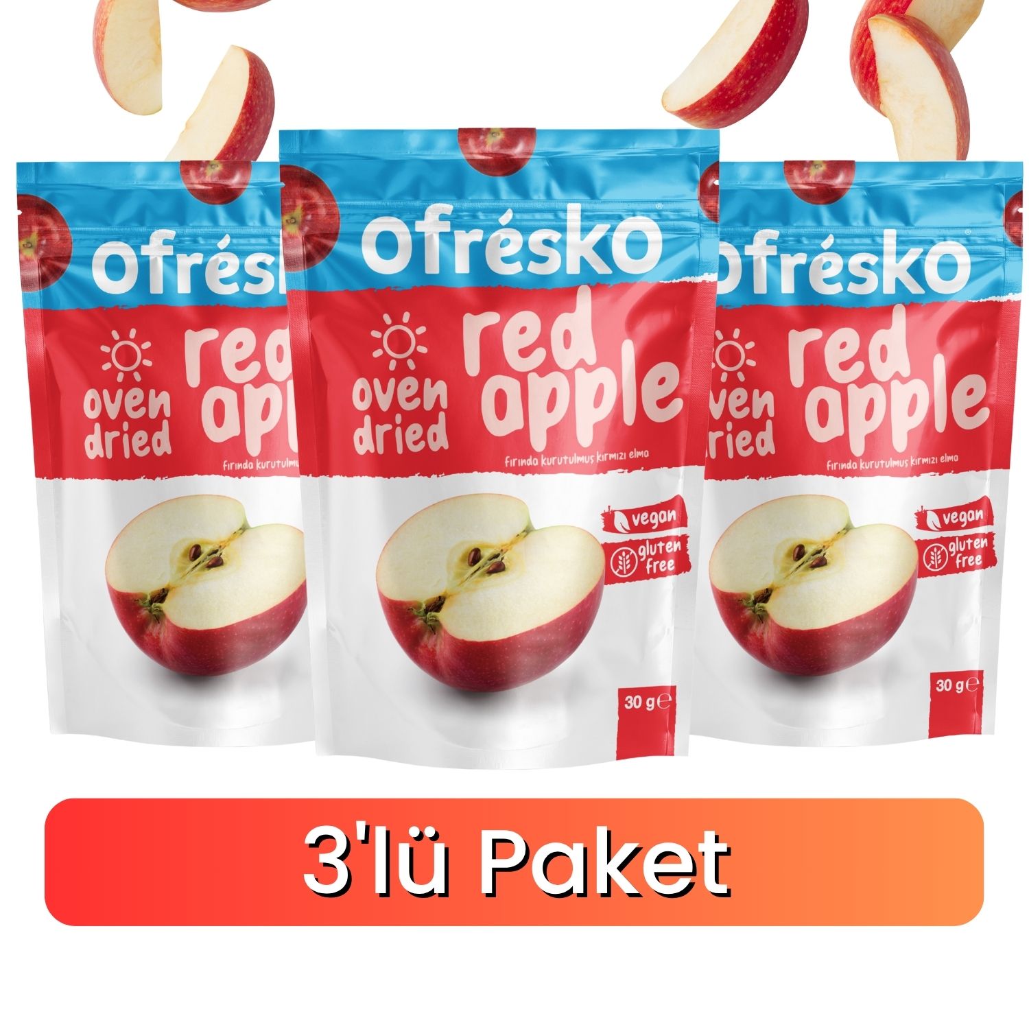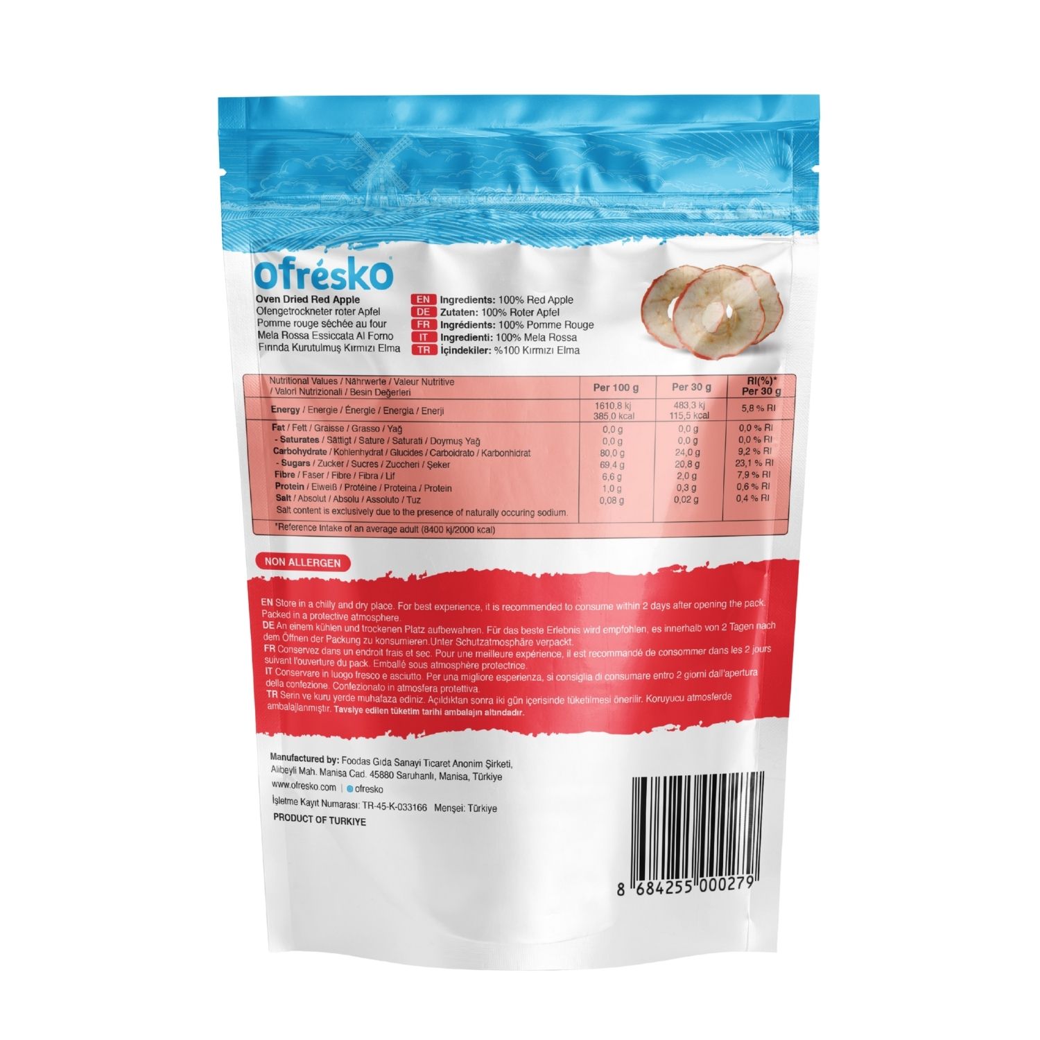 Ofrésko fırınlanarak kurutulmuş kırmızı elma tüm vitamin, mineral, lif ve posa gibi sağlık bileşenlerini büyük ölçüde korur. Her pakette dalından koparılmış tazelik ve lezzette meyveler içerir. Kurutma işlemi mikrobiyolojik süreçleri yavaşlattığı için ürünün bozulmasını geciktirir ve raf ömrünü uzatır.
