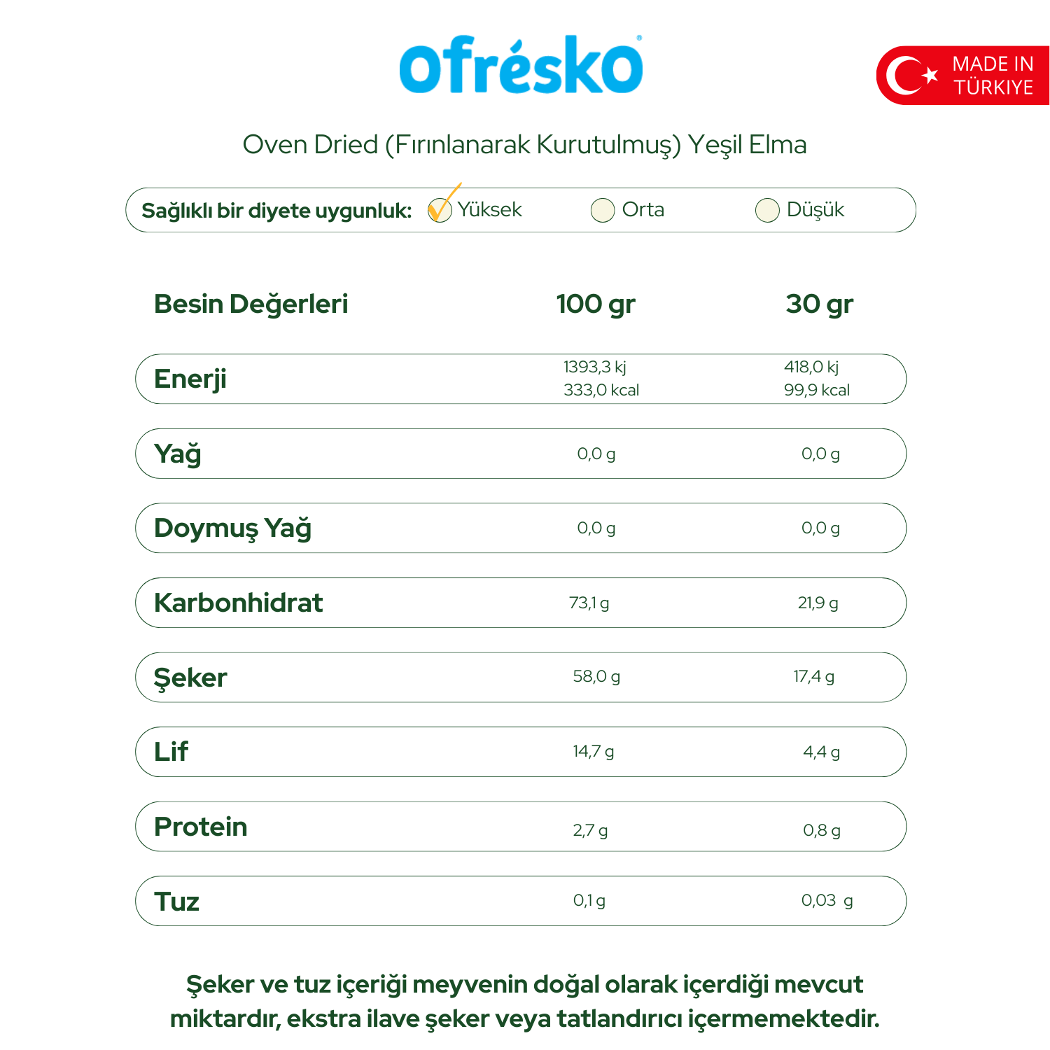 Tüm Ofrésko ürünleri %100 yerli olarak Türkiye’de üretilir, kontrollü tarım uygulaması ile yetiştirilen meyvelerimiz sertifikalı yerel üreticilerden ve bahçelerimizden sağlanmaktadır. Ofrésko fırınlanarak kurutulmuş yeşil elma yalnızca meyvenin kendi şekerini içerir, ekstra bir tatlandırıcı veya katkı maddesi içermemektedir.
