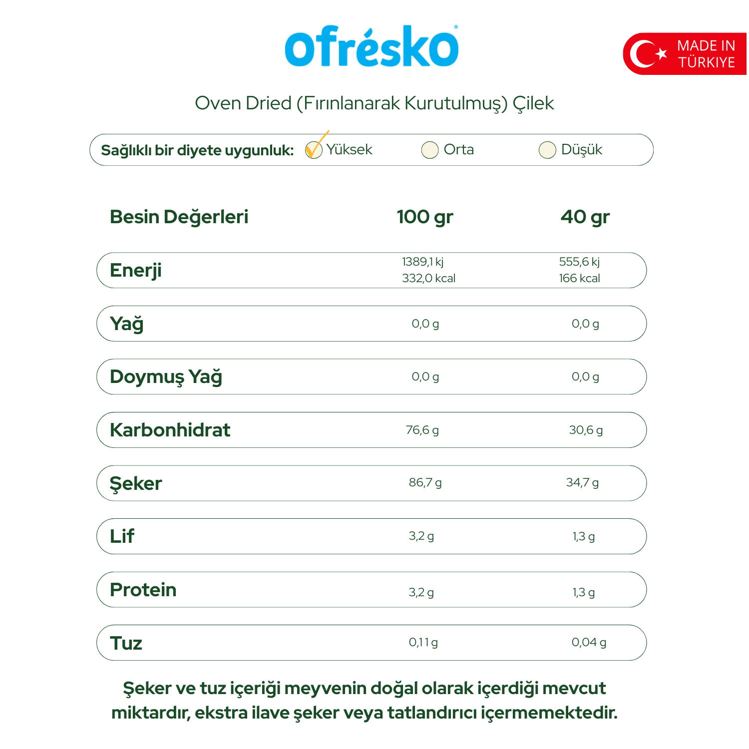 Tüm Ofrésko ürünleri %100 yerli olarak Türkiye’de üretilir, kontrollü tarım uygulaması ile yetiştirilen meyvelerimiz sertifikalı yerel üreticilerden ve bahçelerimizden sağlanmaktadır. Ofrésko fırınlanarak kurutulmuş çilek yalnızca meyvenin kendi şekerini içerir, ekstra bir tatlandırıcı veya katkı maddesi içermemektedir.