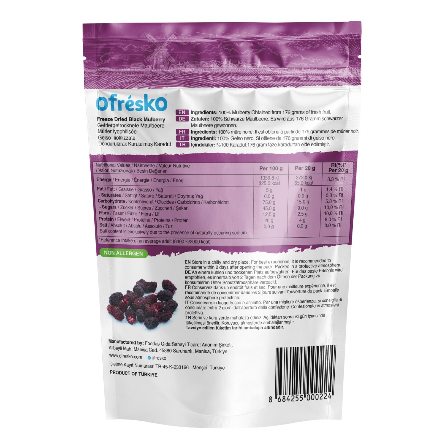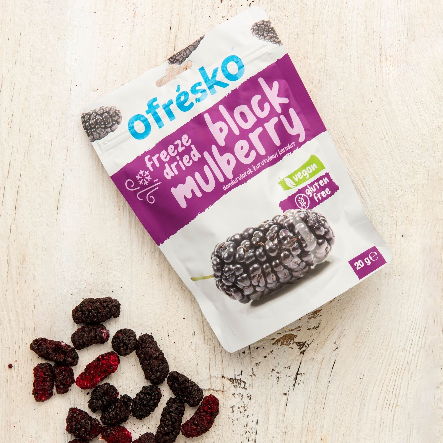 Tüm Ofrésko ürünleri %100 yerli olarak Türkiye’de üretilir, kontrollü tarım uygulaması ile yetiştirilen meyvelerimiz sertifikalı yerel üreticilerden ve bahçelerimizden sağlanmaktadır. Ofrésko kuru karadut yalnızca meyvenin kendi şekerini içerir, ekstra bir tatlandırıcı veya katkı maddesi içermemektedir. Dondurarak kurutma yöntem en sağlıklı ve en iyi meyve kurutma yöntemi olarak kabul edilir. Dondurma işlemi mikrobiyolojik süreçleri yavaşlattığı için ürünün bozulmasını geciktirir ve raf ömrünü uzatır.