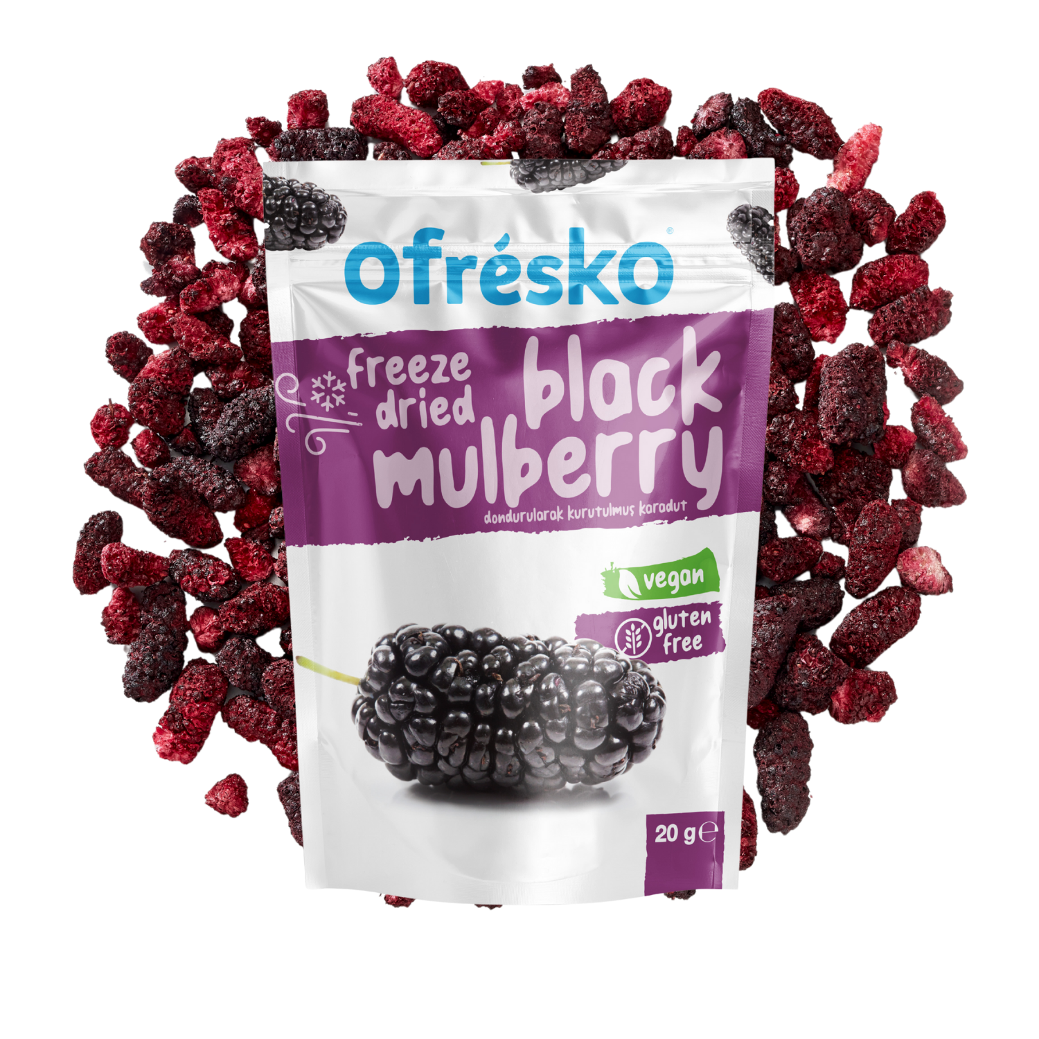 Tüm Ofrésko ürünleri %100 yerli olarak Türkiye’de üretilir, kontrollü tarım uygulaması ile yetiştirilen meyvelerimiz sertifikalı yerel üreticilerden ve bahçelerimizden sağlanmaktadır. Ofrésko kuru karadut yalnızca meyvenin kendi şekerini içerir, ekstra bir tatlandırıcı veya katkı maddesi içermemektedir. Dondurarak kurutma yöntem en sağlıklı ve en iyi meyve kurutma yöntemi olarak kabul edilir. Dondurma işlemi mikrobiyolojik süreçleri yavaşlattığı için ürünün bozulmasını geciktirir ve raf ömrünü uzatır.