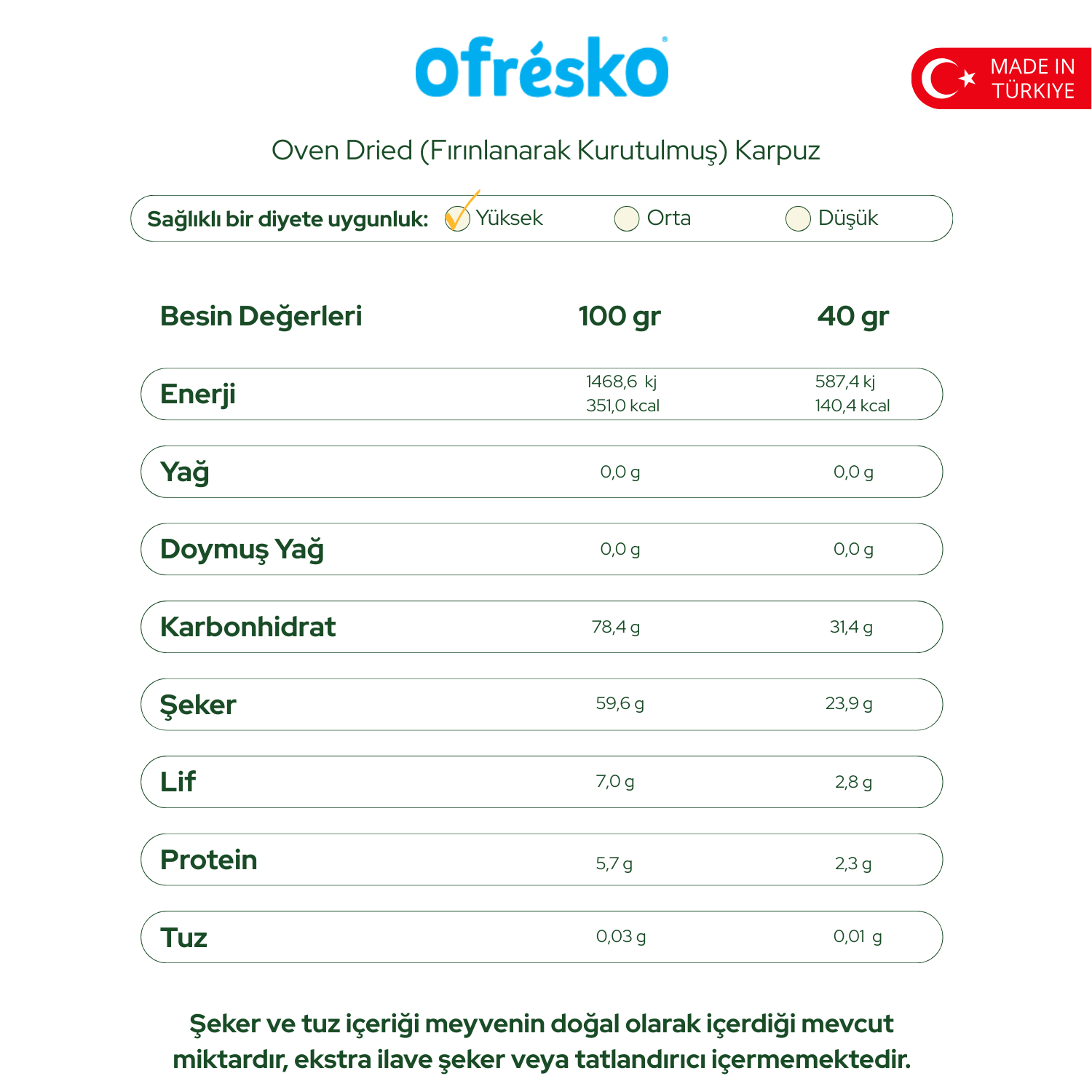 Tüm Ofrésko ürünleri %100 yerli olarak Türkiye’de üretilir, kontrollü tarım uygulaması ile yetiştirilen meyvelerimiz sertifikalı yerel üreticilerden ve bahçelerimizden sağlanmaktadır. Ofrésko fırınlanarak kurutulmuş karpuz yalnızca meyvenin kendi şekerini içerir, ekstra bir tatlandırıcı veya katkı maddesi içermemektedir.