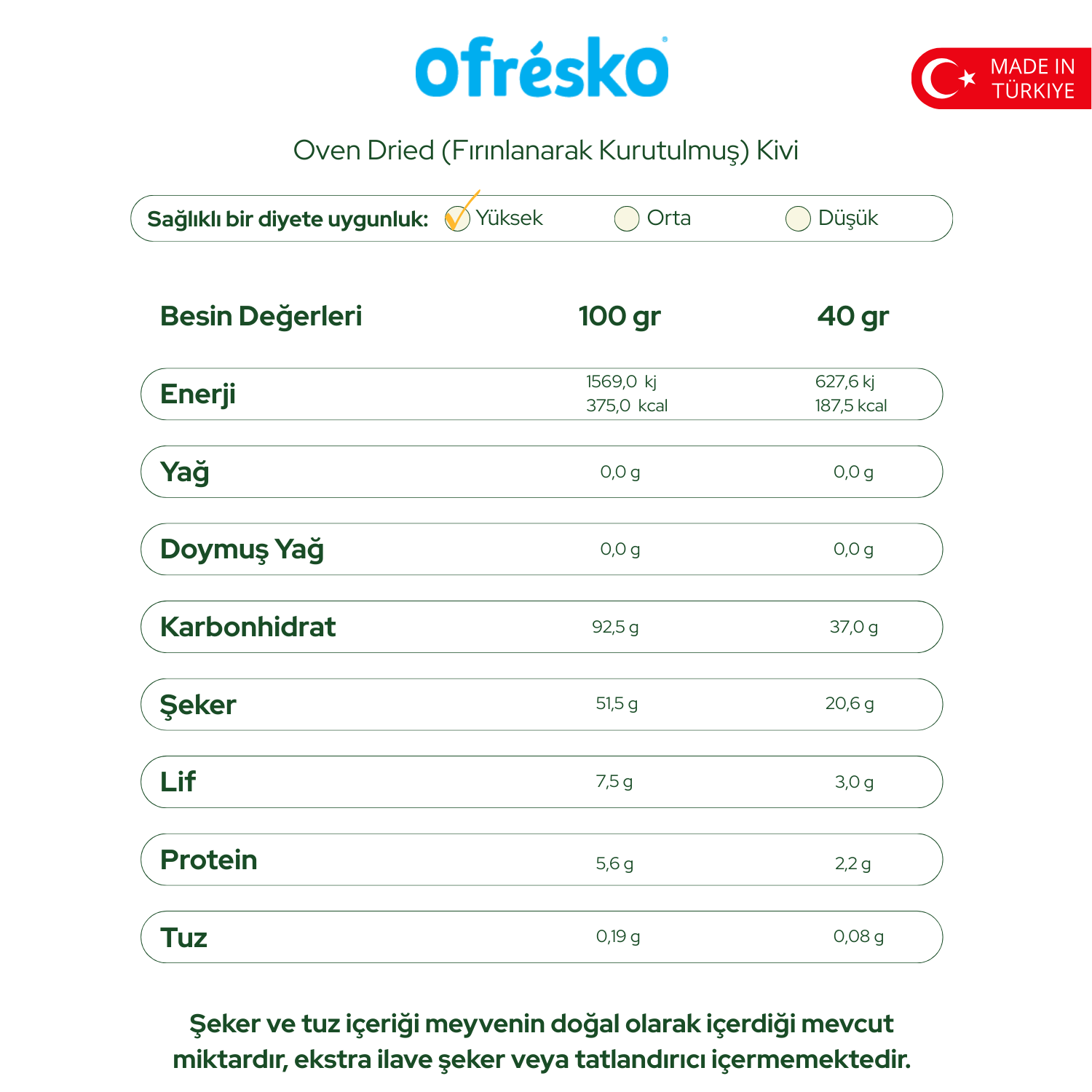 Tüm Ofrésko ürünleri %100 yerli olarak Türkiye’de üretilir, kontrollü tarım uygulaması ile yetiştirilen meyvelerimiz sertifikalı yerel üreticilerden ve bahçelerimizden sağlanmaktadır. Ofrésko fırınlanarak kurutulmuş kivi yalnızca meyvenin kendi şekerini içerir, ekstra bir tatlandırıcı veya katkı maddesi içermemektedir.